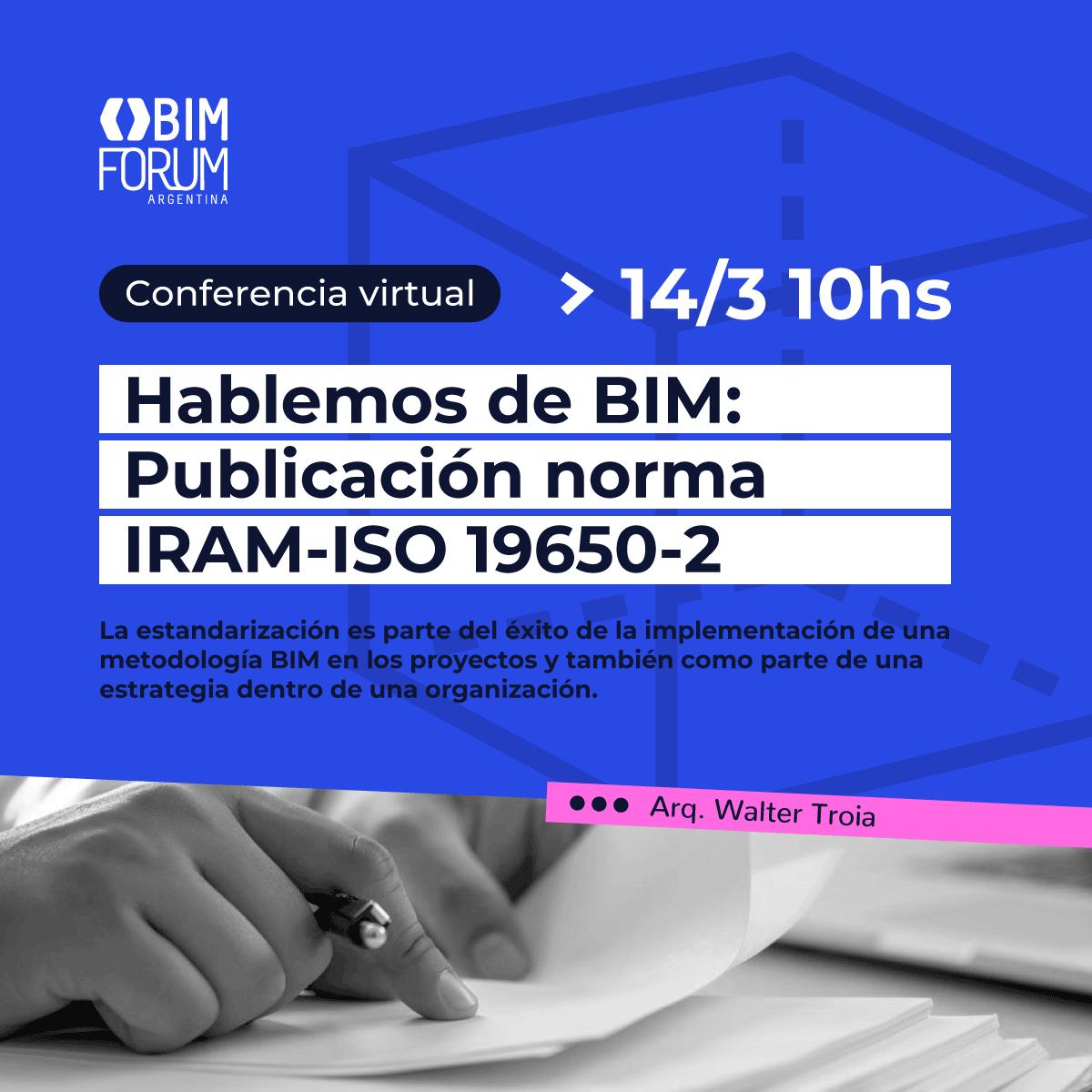 Te invitamos a esta presentación virtual que realizaremos el martes 14 de marzo a las 10hs a cargo del Arq. Walter Troia, Miembro del Subcomité IRAM TC59/SC13 y Coordinador del Grupo de Buenas Prácticas de este fórum, para conocer en profundidad la norma IRAM-ISO 19650-2 y el camino de la estándarización BIM en el cual se inserta.